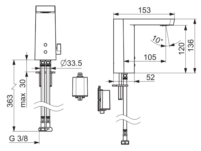 Dane techniczne: - zasięg baterii: 105 mm - wysokość baterii: 136 mm - przepływ wody: 0,08L/s - wielkość przyłącza: G3/8 - woda ciepła zasilająca: max. +70°C - ciśnienie robocze: 100 - 1000 kPa - zasilanie baterią: 2CR5 6V