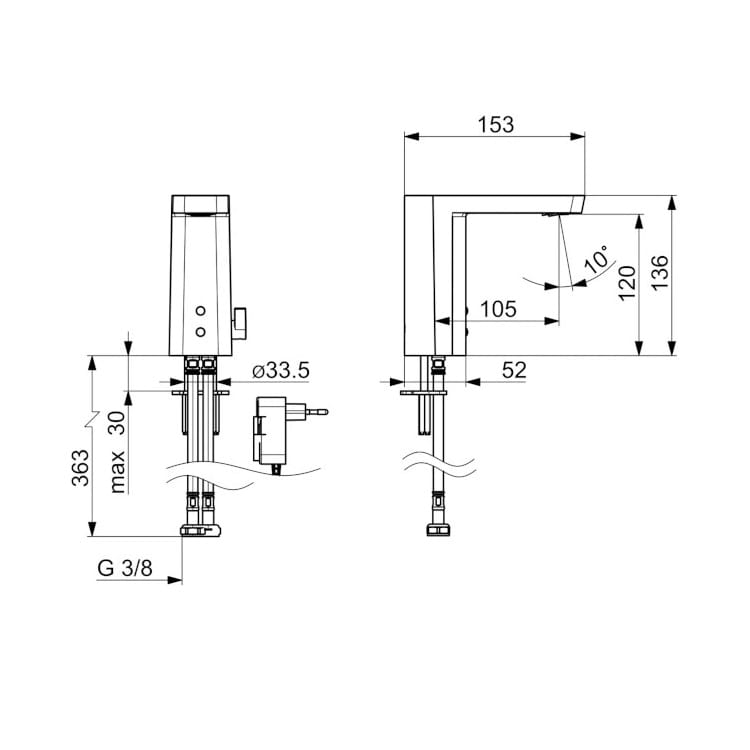Dane techniczne: - przyłącze: G3/8 - zasięg wylewki: 105 mm - wysokość baterii: 136 mm - długośc baterii: 153 mm - podłączenie elektryczne: 230 / 9 V - natężenie przepływu przy 300 kPa: 0.08 l/s - spadek ciśnienia dla przepływu (0.1 l/s): 200 kPa