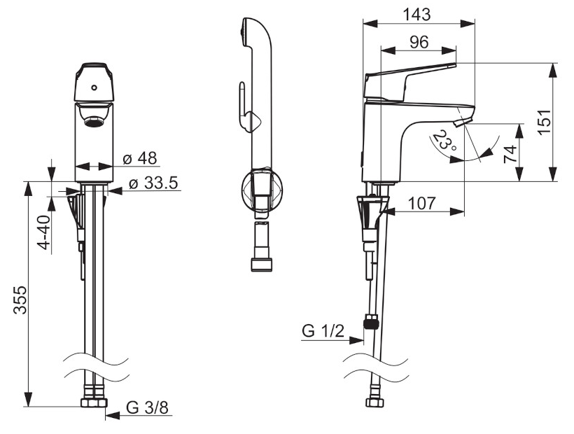 Dane techniczne: - przepływ wody: 0,13L/s - przepływ wody w wersji eko: 0,09L/s - zasięg baterii: 107 mm - średnica głowicy: 40 mm - średnica przyłączy: 3/8" - wysokość baterii: 151 mm - ciśnienie robocze: 50-1000 kPa - woda ciepła zasilająca max: 70 stopni C