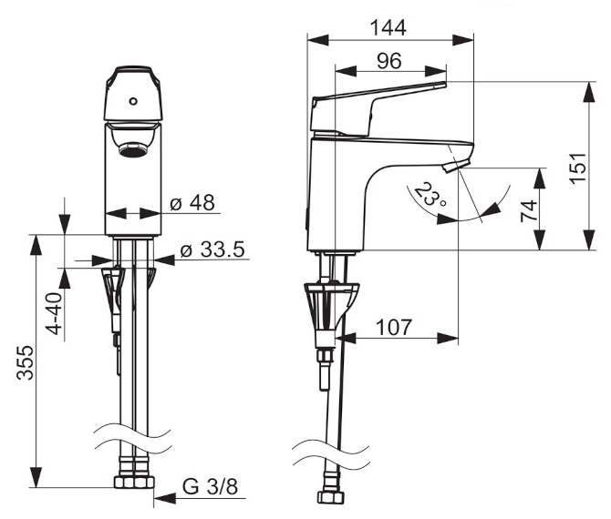 Dane techniczne: - przepływ wody: 0,18L/s - przepływ wody w wersji eko: 0,11L/s - zasięg baterii: 107 mm - średnica głowicy: 40 mm - średnica przyłączy: 3/8" - wysokość baterii: 151 mm - ciśnienie robocze: 50-1000 kPa - woda ciepła zasilająca max: 70 stopni C
