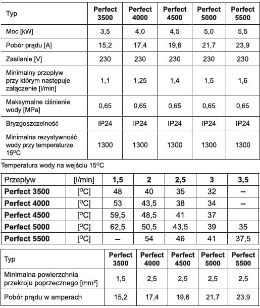 Przepływowy ogrzewacz wody serii Perfect 4500 jest ogrzewaczem ciśnieniowym o mocy 4,5kW zasilanym napięciem 230V. Przeznaczony jest do zaopatrywania w ciepłą wodę jednopunktowych źródeł poboru wody, takich jak umywalka, zlewozmywak