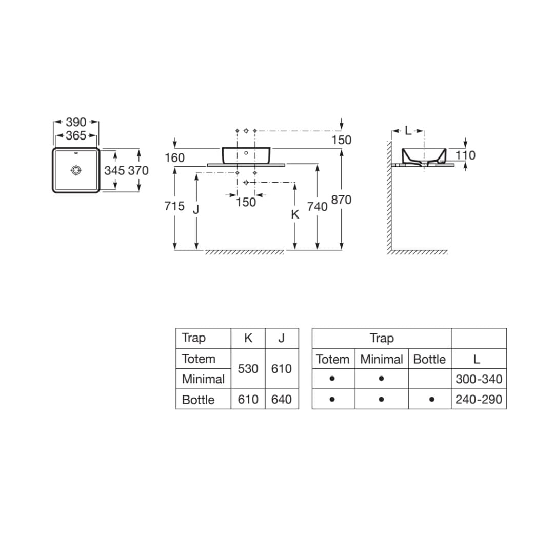 Dane techniczne: - szerokość: 390 mm - głębokość: 370 mm - wysokość: 130 mm - pojemność umywalki: 3,9 l