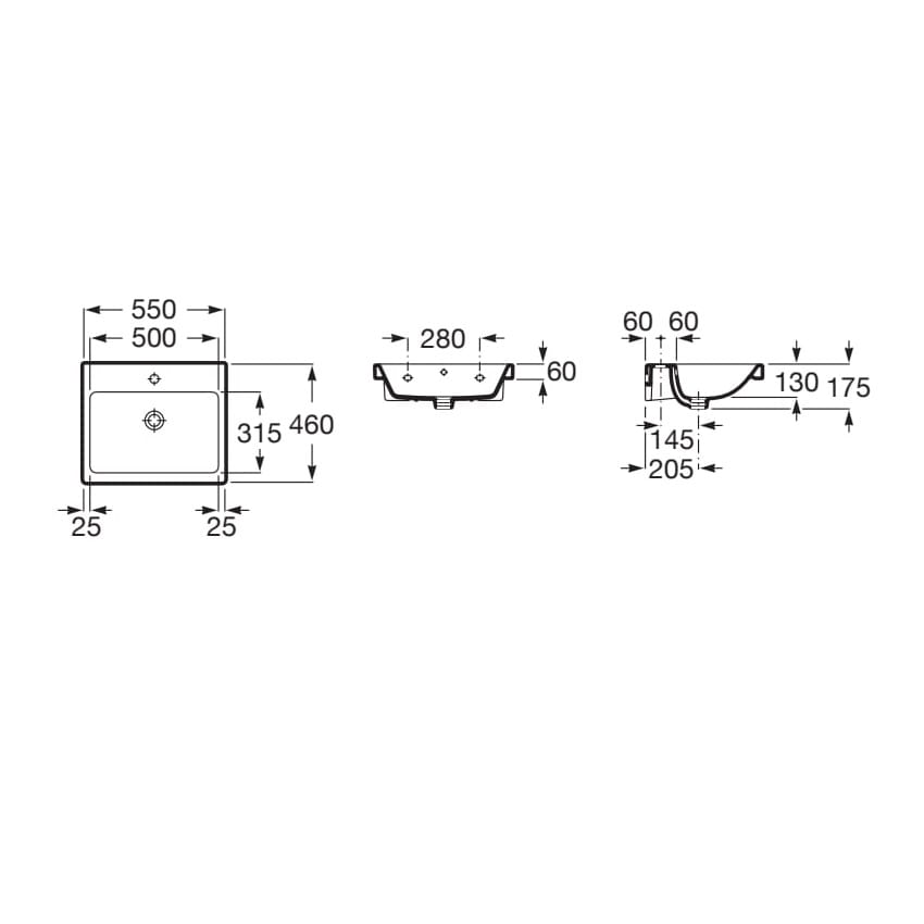 Dane techniczne: - długość: 550 mm - szerokość: 460 mm - wysokość: 175 mm - pojemność umywalki: 8 l