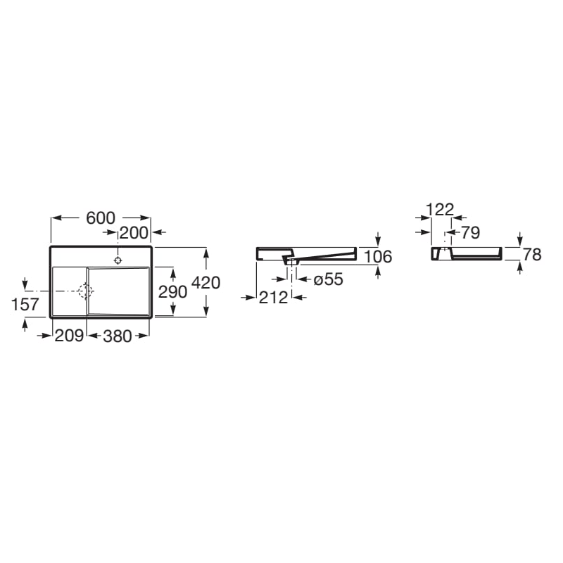 Dane techniczne: - szerokość: 600 mm - głębokość: 420 mm - wysokość: 78 mm - pojemność umywalki: 5 l