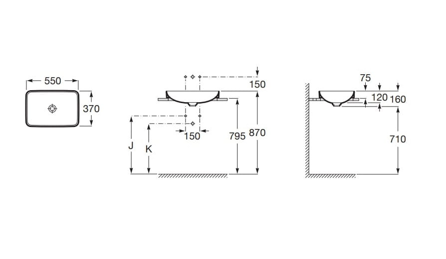Dane techniczne: - długość: 550 mm - szerokość: 370 mm - wysokość: 120 mm - pojemność umywalki: 14.4 l