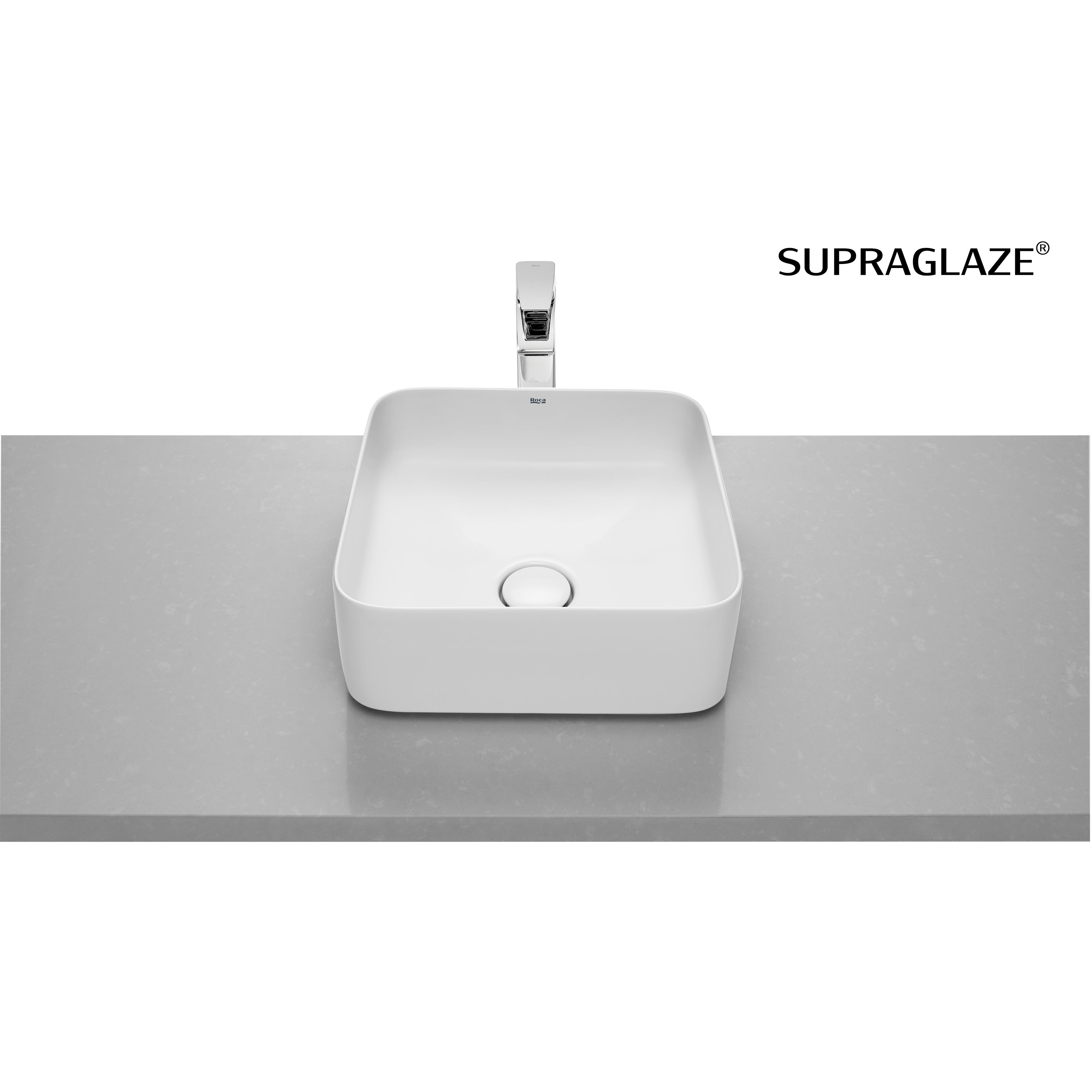 Główne cechy: - kolor: Supraglaze® - materiał: Fineceramic® - kształt: kwadratowa - sposób montażu: na blacie - brak otworu na baterię - bez przelewu