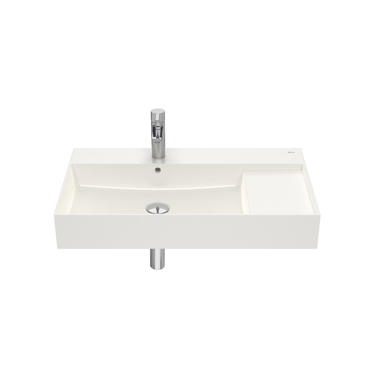 Główne cechy: - kolor: beżowy - kształt: prostokątna - materiał: FINECERAMIC - położenie niecki: po lewej stronie - położenie otworu na baterie: 1 nacięcie, 1 otwór, 1 nacięcie - położenie półki: po prawej stronie - sposób montażu: do ściany, na meblu