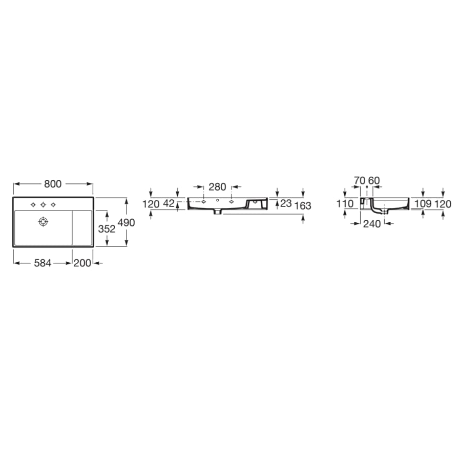 Dane techniczne: - szerokość: 800 mm - głębokość: 490 mm - wysokość: 120 mm - długość niecki: 584 mm - szerokość niecki: 352 mm - wysokość niecki: 109 mm - pojemność umywalki: 13,25 l