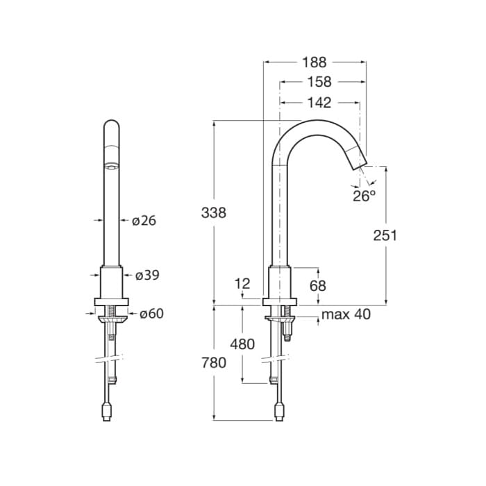 Dane techniczne: - wysokość: 338 mm - długość: 188 mm - zasięg wylewki: 142 mm