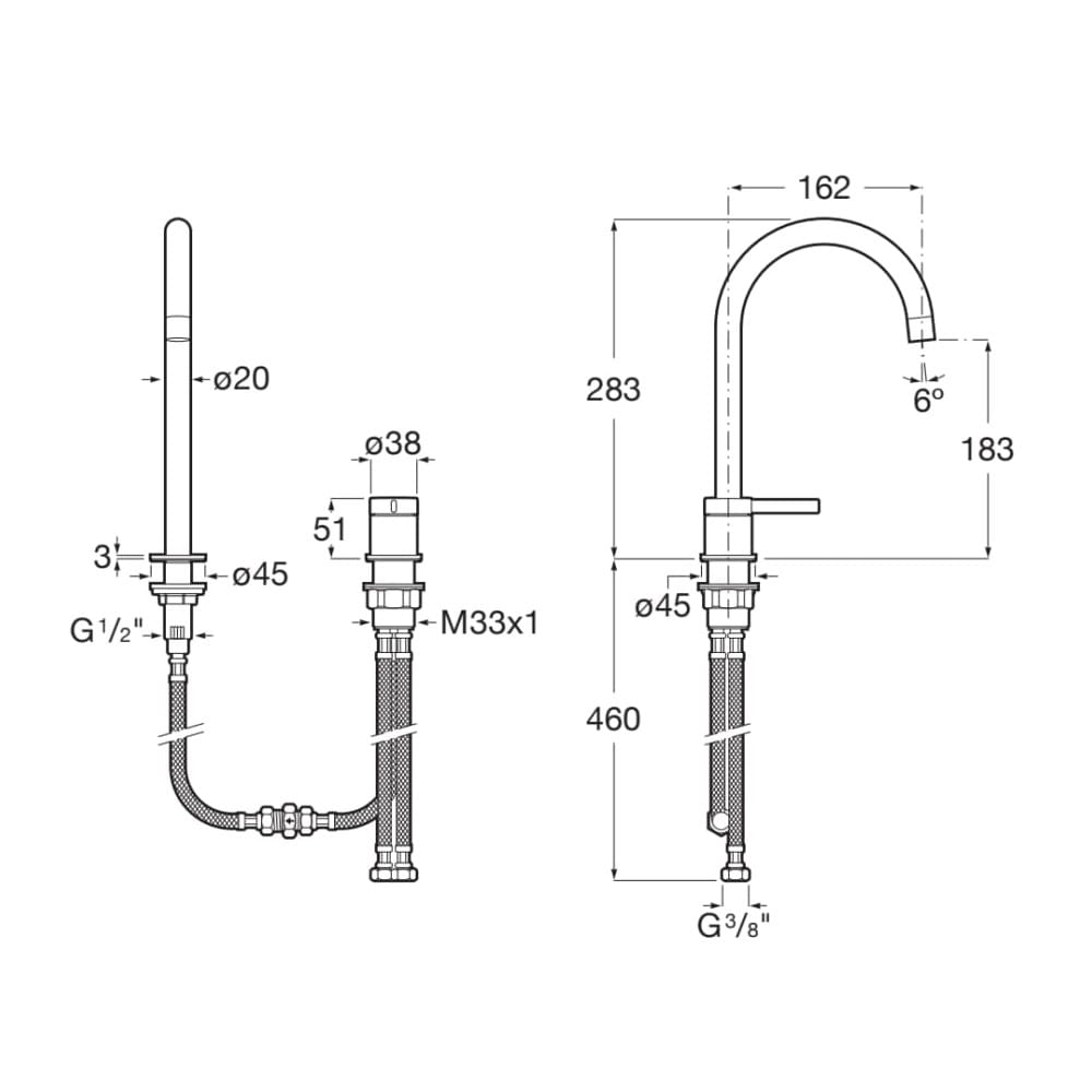 Dane techniczne: - wysokość: 283 mm - zasięg wylewki: 162 mm - przyłącze: G 3/8 - przepływ (l/min - 3 bar): 5 - natężenie dźwięku (dB): Grupa 1 (do 20 dB)