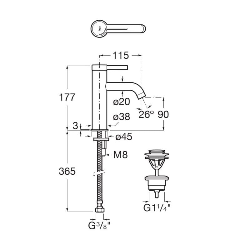 Dane techniczne: - przyłącze: G3/8 - zasięg wylewki: 115 mm - wysokość baterii: 177 mm - wysokość do aeratora: 90 mm