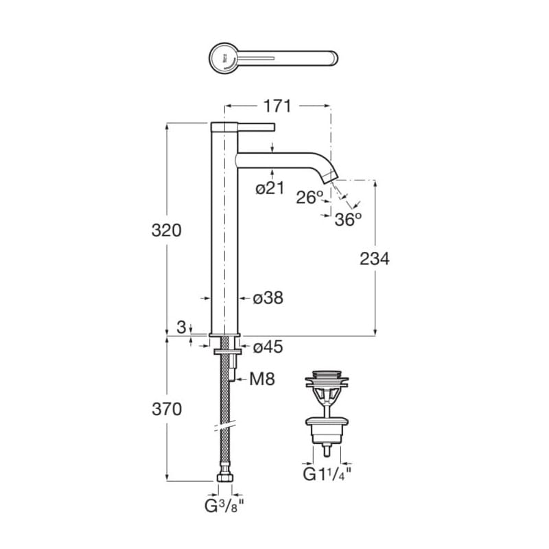 Dane techniczne: - przyłącze: G3/8 - zasięg wylewki: 171 mm - wysokość baterii: 320 mm - wysokość do aeratora: 234 mm