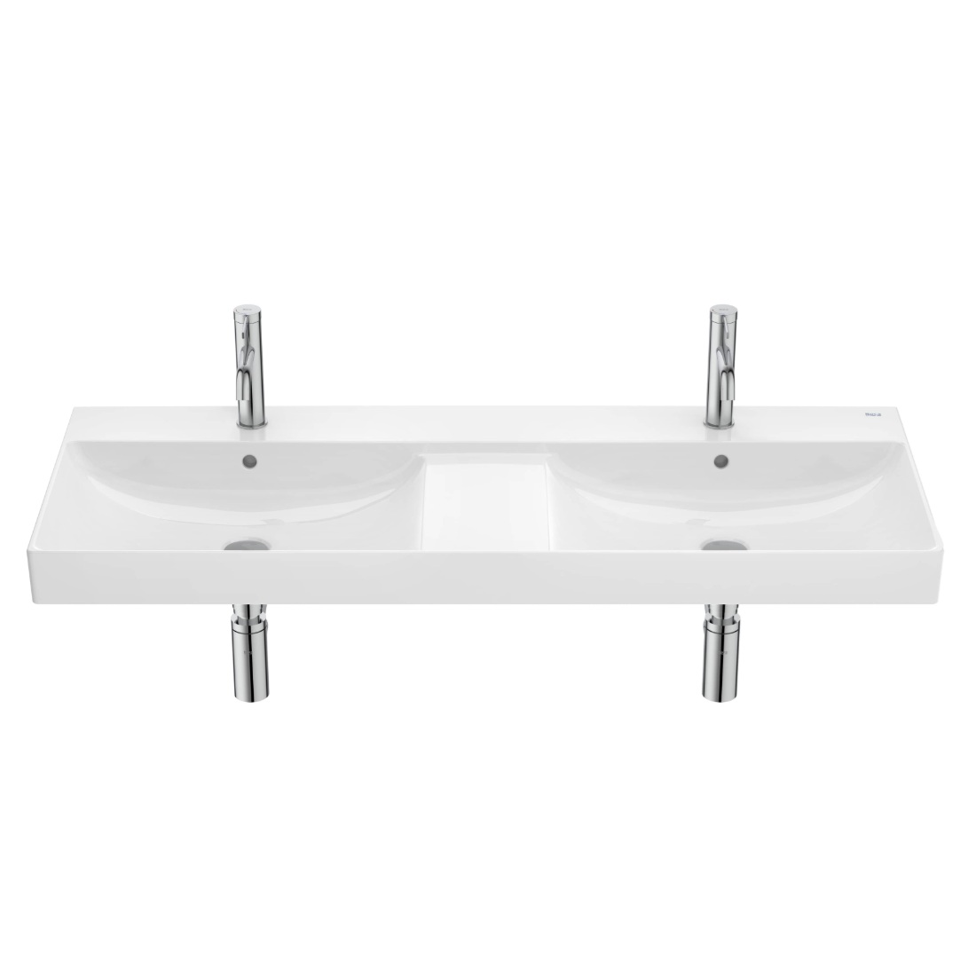 Główne cechy: - kolor: biała - finceceramic: zastosowanie materiału, dzięki któremu można formować w bardziej smukłe kontury, tworząc jednocześnie produkty bardziej wytrzymałe i lżejsze niż te wykonane z tradycyjnej ceramiki. - Sposób montażu: naścienny - Umywalka podwójna - zintegrowana półka