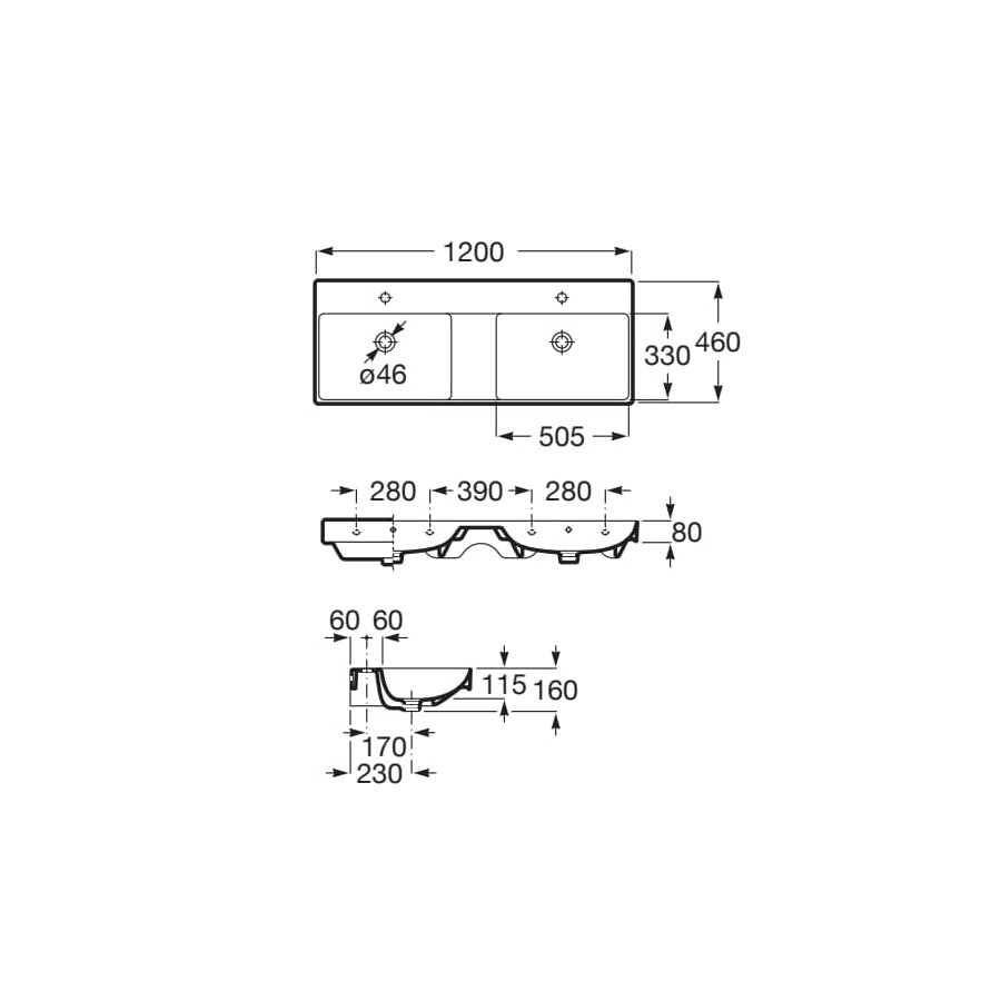Dane techniczne: - szerokość: 1200 mm - głębokość: 460 mm - wysokość: 160 mm - pojemność umywalki (l): 6,8