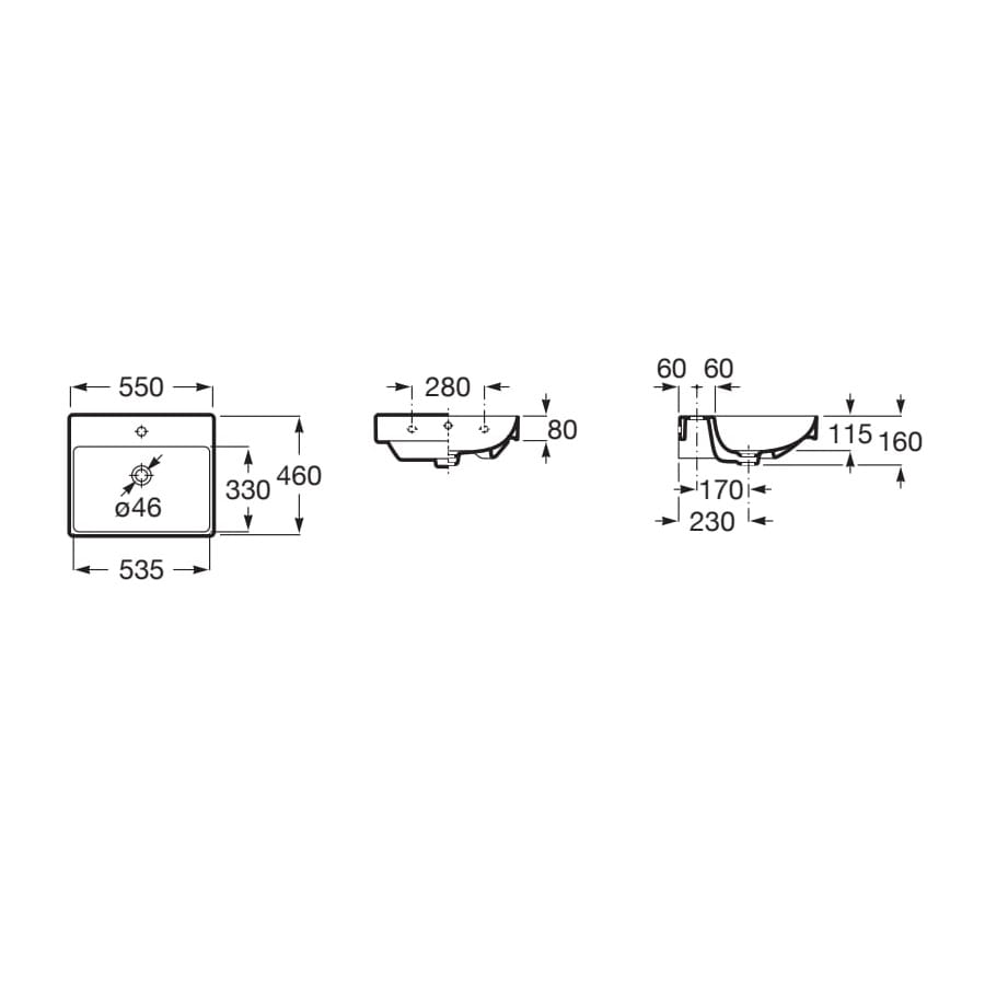 Dane techniczne: - szerokość: 550 mm - głębokość: 460 mm - wysokość: 160 mm - pojemność umywalki: 7 l