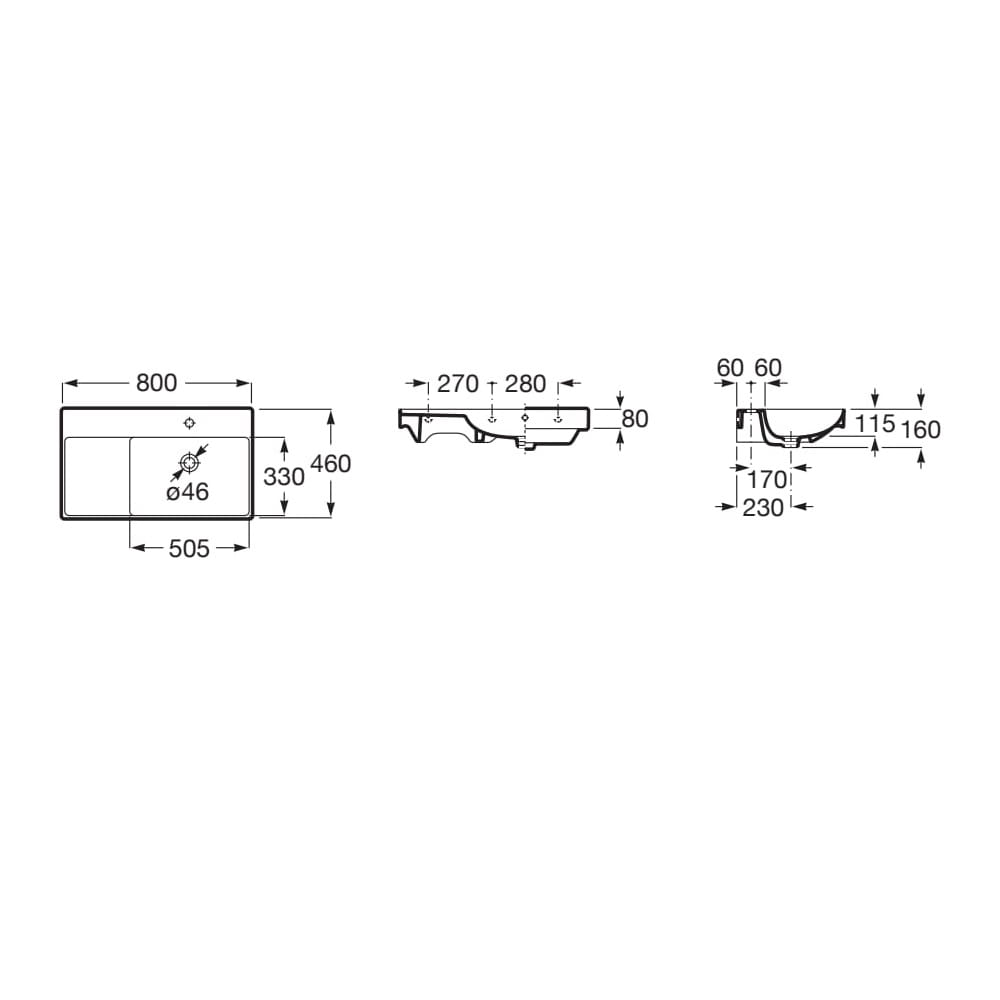 Dane techniczne: - szerokość: 800 mm - głębokość: 460 mm - wysokość: 160 mm - pojemność umywalki: 6,9 l