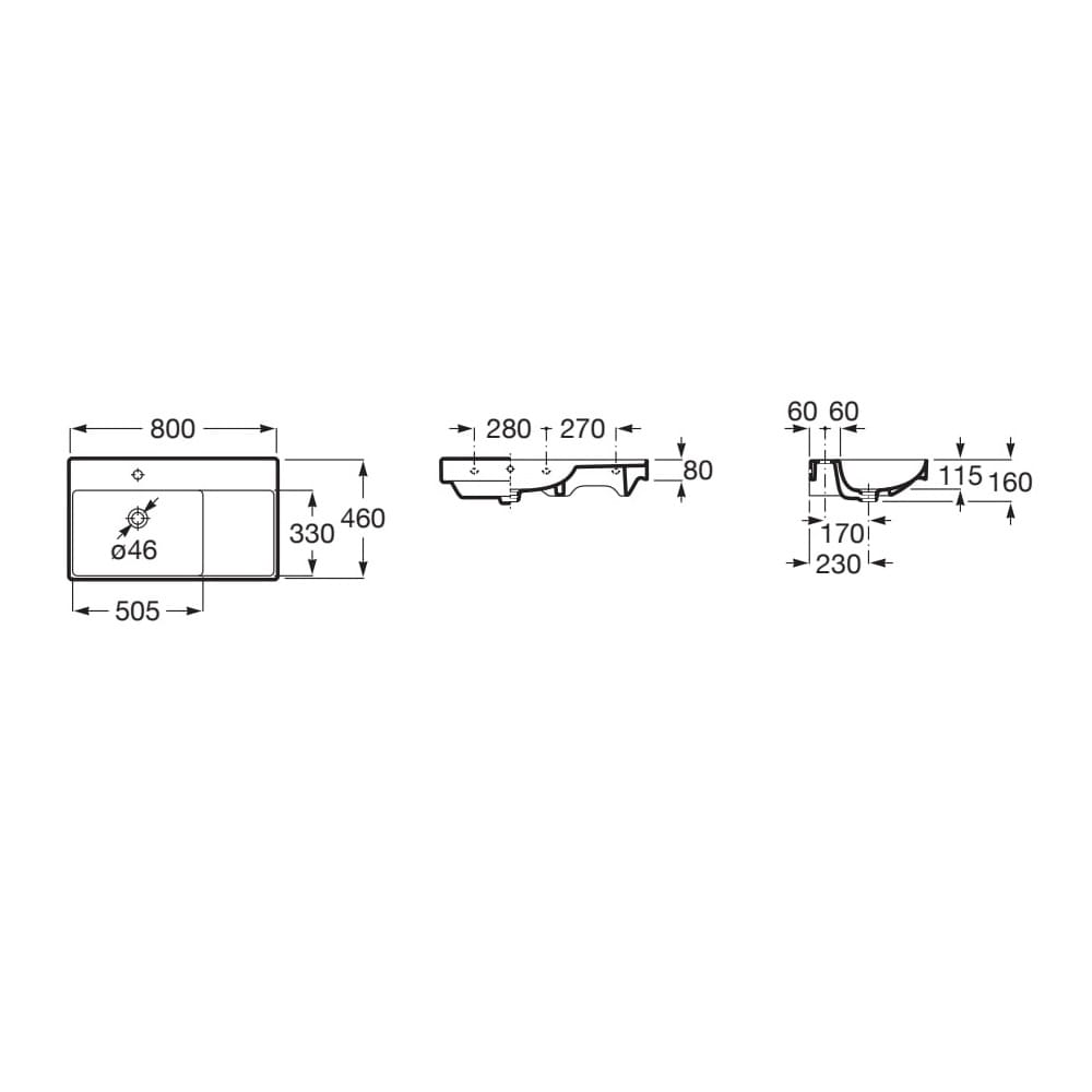 Dane techniczne: - szerokość: 800 mm - głębokość: 460 mm - wysokość: 160 mm - pojemność umywalki: 6,9 l