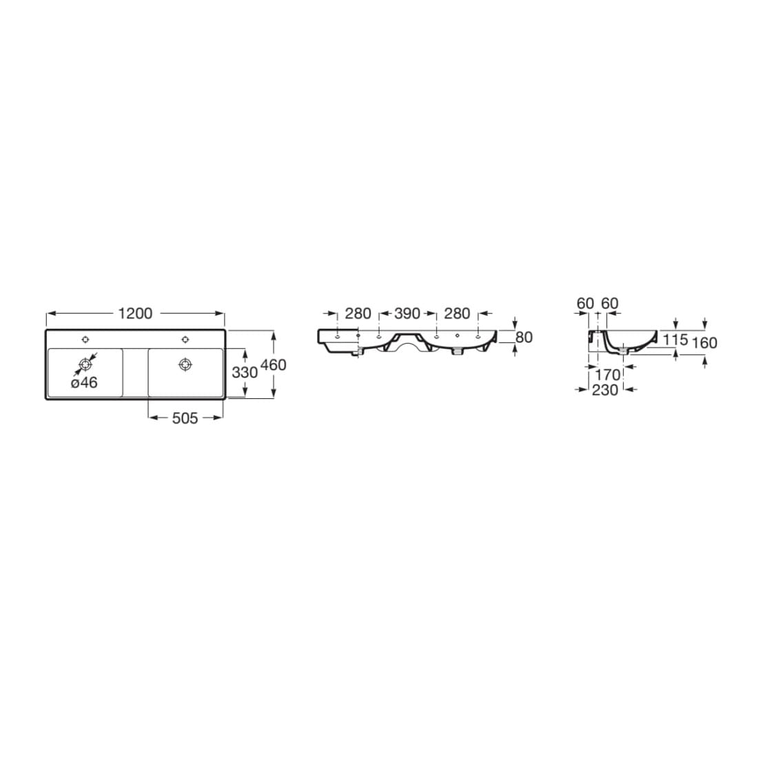 Dane techniczne: - szerokość: 1200 mm - głębokość: 460 mm - wysokość: 160 mm - pojemność umywalki: 6,8 l