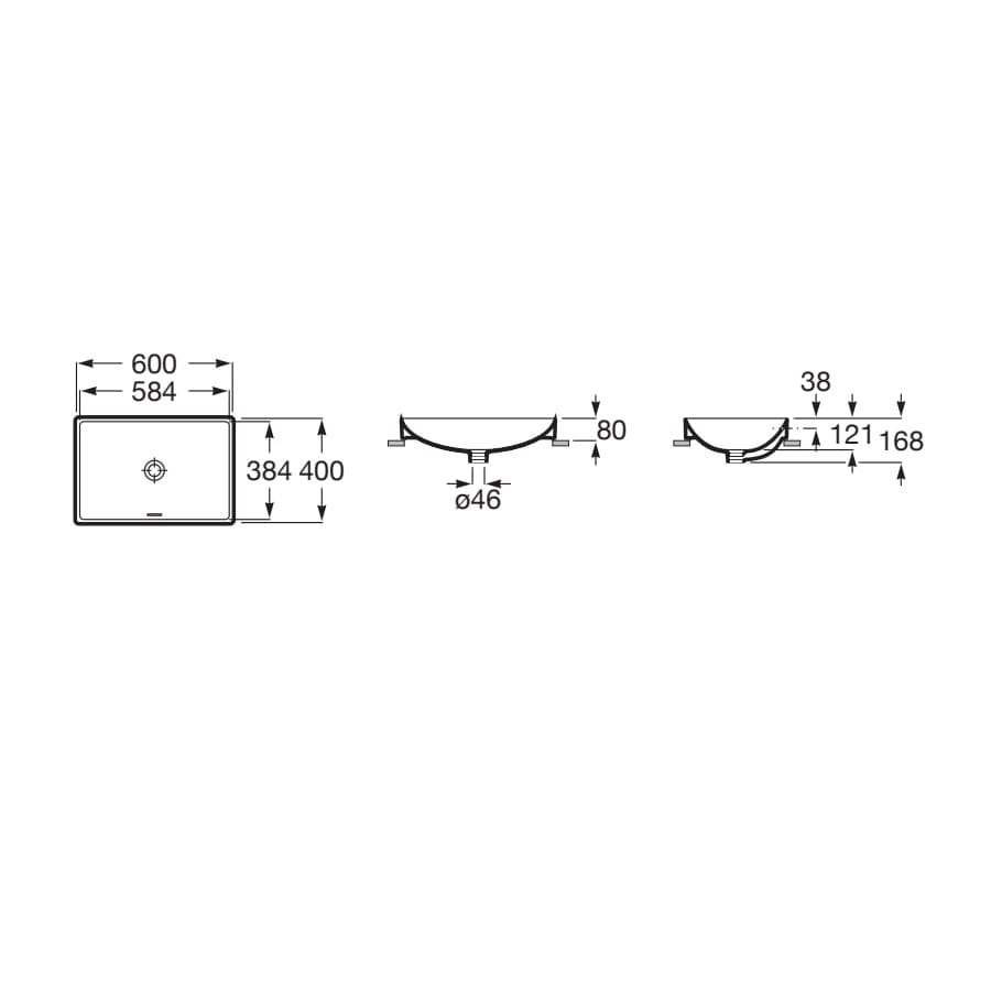 Dane techniczne: - szerokość: 600 mm - głębokość: 400 mm - wysokość: 80 mm - pojemność umywalki: 5 l