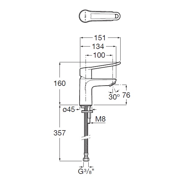 Dane techniczne: - wysokość: 160 mm - długość: 151 mm - zasięg wylewki: 100 mm - przyłącze: G 3/8 - przepływ (l/min - 3 bar): 5