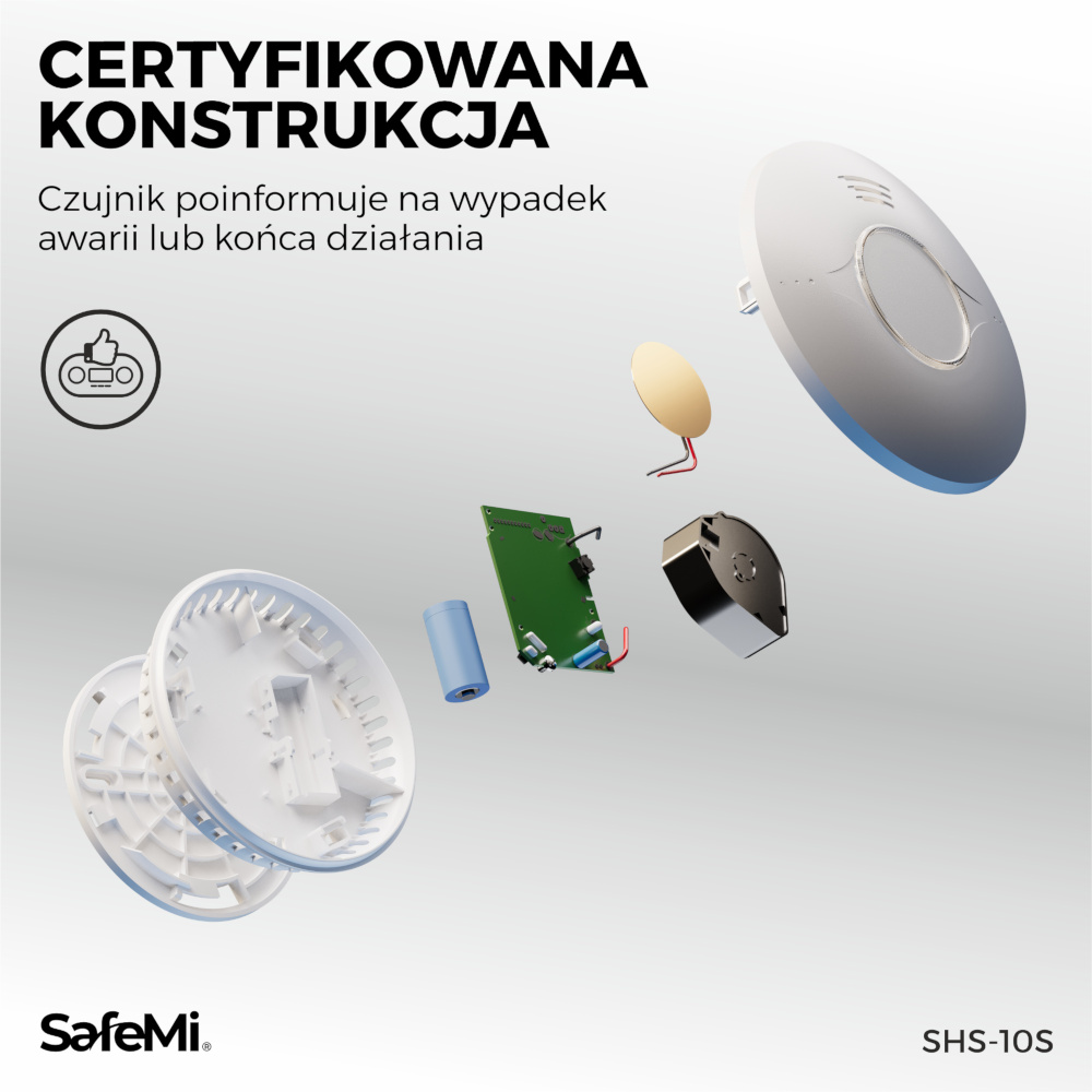 Dowodem najwyższych standardów jakości są certyfikaty zgodności z normą PN-EN14604 wystawione przez akredytowane laboratoria, co gwarantuje odpowiedni poziom bezpieczeństwa czujników marki SafeMi. Wybierając czujnik SHS-10Wmasz pewność zgodności z obowiązującymi przepisami, w tym tych dotyczących wyrobów budowlanych.