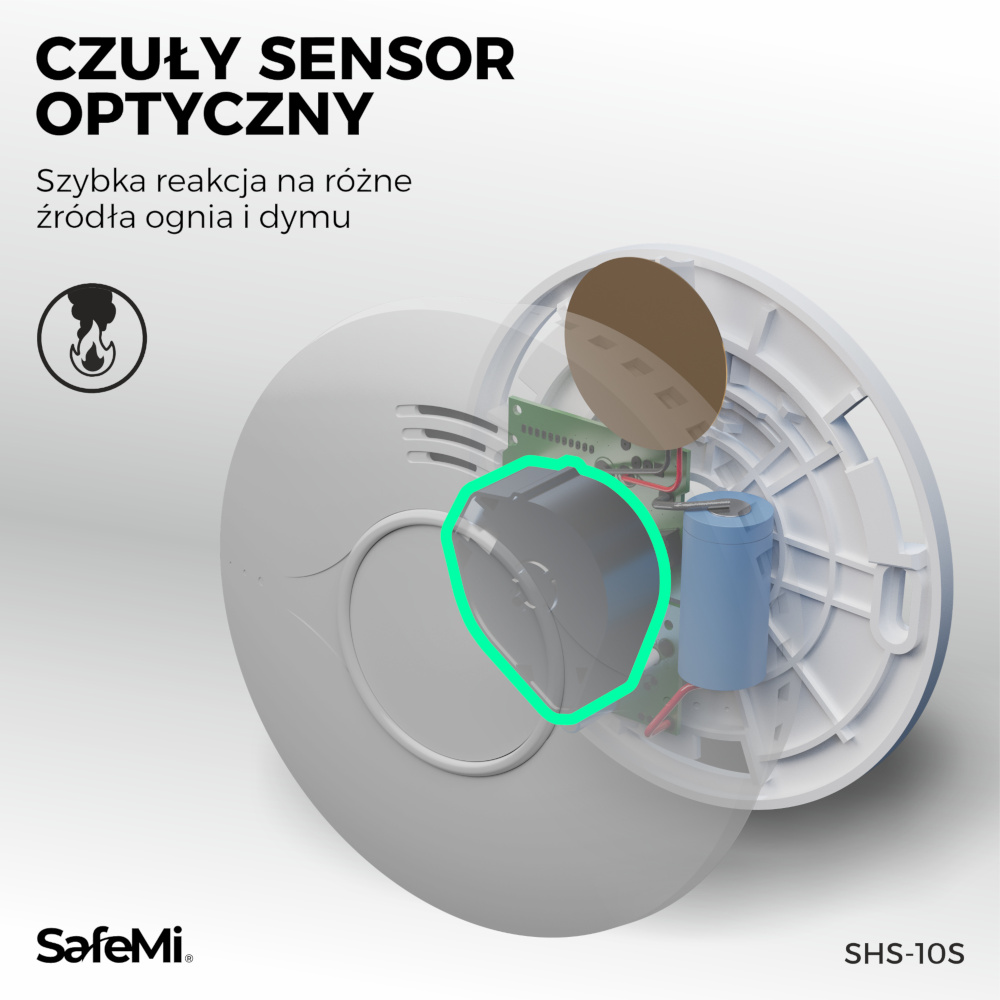 Czujnik dymu SafeMi SHS-10Wposiada dopracowany sensor optyczny, który szybko i sprawnie reaguje na różne rodzaje źródeł ognia i dymu. Nawet niewielka ilość dymu wzbudzi głośny alarm, ostrzegając użytkowników i dając im szansę na podjęcie działań oraz ewakuację.