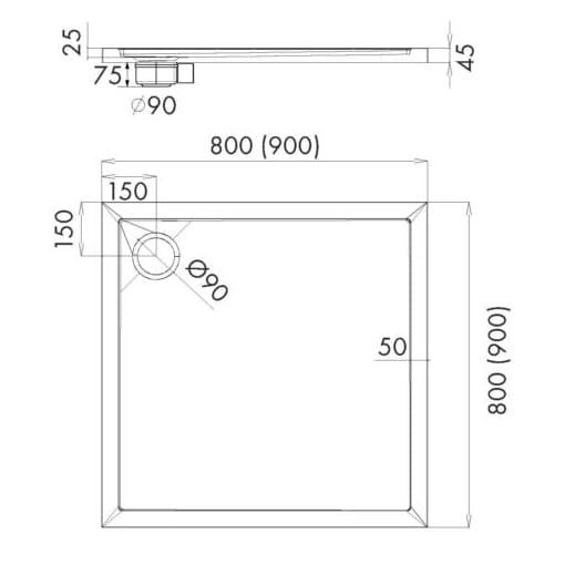 Dane techniczne: - długość: 80 cm - szerokość: 80 cm - wysokość 4,5 cm - głębokość 2,5 cm - średnica odpływu: 90 mm - syfon czyszczony od góry (90mm, przepływ 43,8 l/min, wysokość 8 cm)