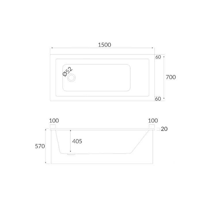 Dane techniczne: - długość: 1500 mm - szerokość: 700 mm - wysokość: 570 mm - średnica odpływu: 52 mm - ranty Slim: 20 mm