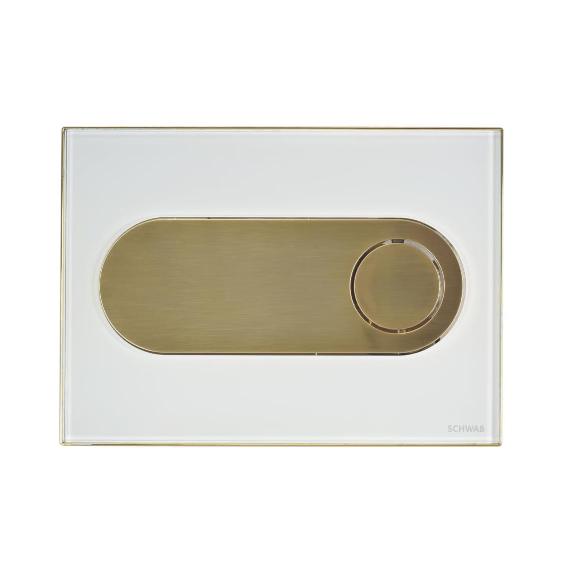 Główne cechy: - kolor: biały/ złoty - materiał: szkło - rodzaj uruchomienia: mechaniczny - przycisk do spłukiwania dwudzielnego - uruchamianie od przodu - do spłuczek podtynkowych SCHWAB 189 i 198