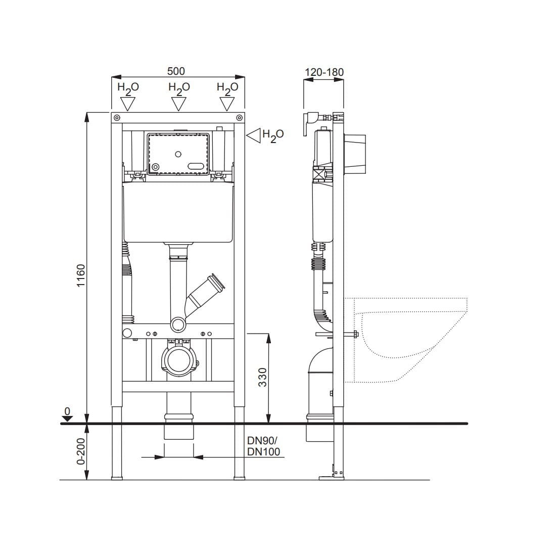 Dane techniczne: - przyłącze wody: 1/2 cala - profil ramy: 40x40 mm - szerokość: 500 mm - głębokość: 120 - 180 mm - wysokość: 1160 - 1360 mm - regulowana wielkość spłukiwania: duże spłukiwanie 5/6/7 l, małe spłukiwanie 3/4 l