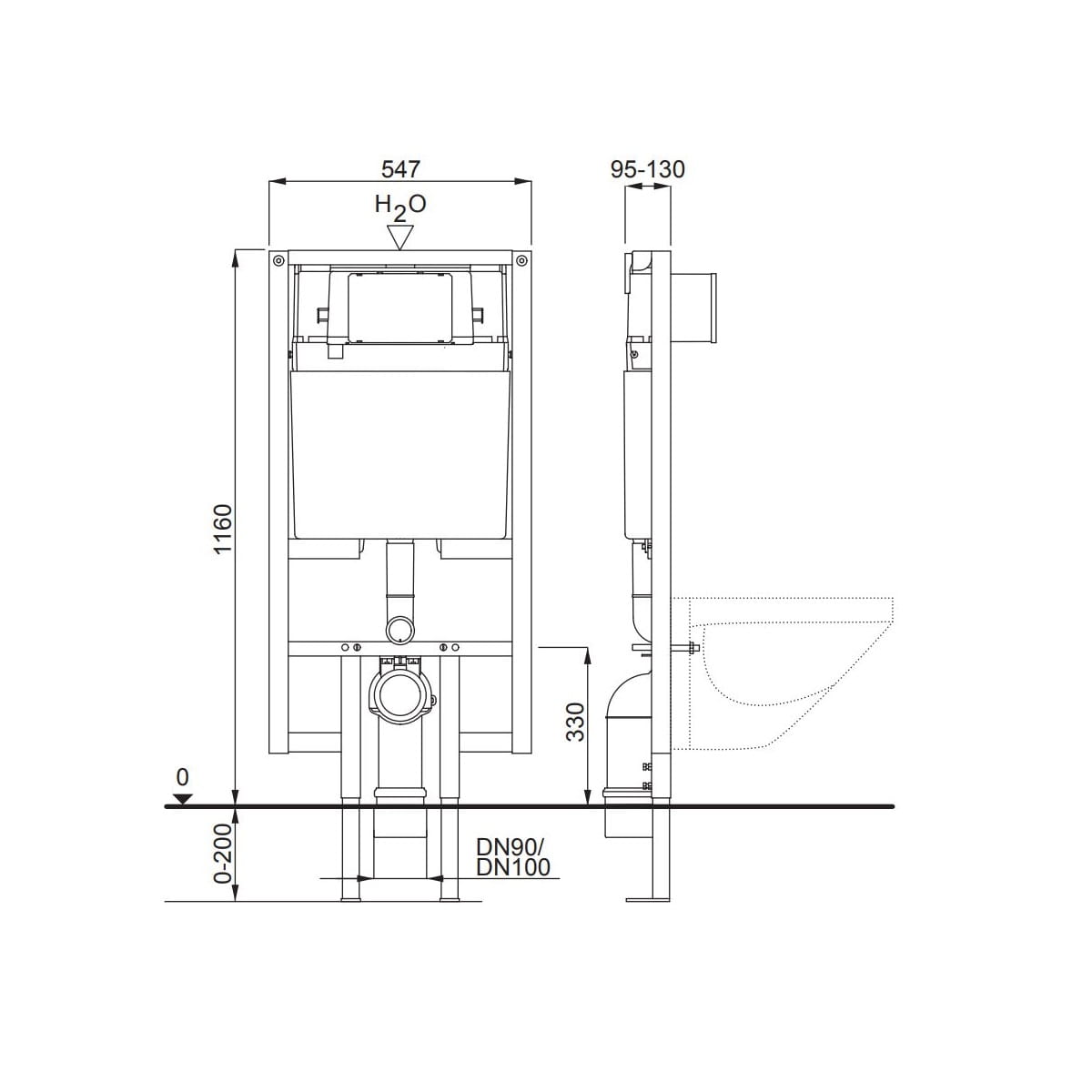 Dane techniczne: - przyłącze wody: 1/2 cala - profil ramy: 40x40 mm - szerokość: 547 mm - głębokość: 95 - 130 mm - wysokość: 1160 - 1360 mm - regulowana wielkość spłukiwania: duże spłukiwanie 7-9 l, małe spłukiwanie 2-4 l
