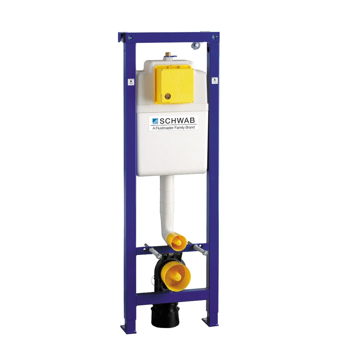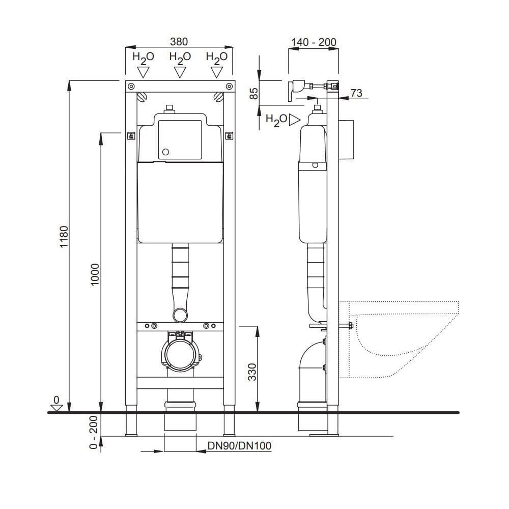 Główne cechy: - stelaż do miski WC - przyścienny, malowany proszkowo - fabrycznie instalowana spłuczka podtynkowa 380 UP - spłuczka podtynkowa z fabrycznie zamontowanym zaworem odcinającym – na górze, po środku - cichy, hydrauliczny zawór napełniający - aktywacja pneumatyczna - spłukiwanie uruchamiane z przodu - spłukiwanie typu start-stop (6 l) - spłukiwanie dwudzielne (3/6 l) - regulowana ilość wody spłukującej - wyposażony w ogranicznik przepływu zapobiegający pryskaniu przy użyciu z toaletą bezkołnierzową - montowane fabrycznie wsporniki ścienne i nogi montażowe o regulowanej długości (0-200 mm) - podłączenie wody możliwe w czterech miejscach - zaizolowany przed kondensacją pary wodnej - kolano odpływowe o regulowanej głębokości - średnica kolana odpływowego do WC: 90 z uszczelką - średnica złączki przejściowej: 90/ 110 mm, z uszczelką