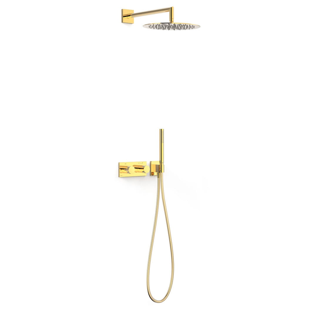 Główne cechy: - kolor: 24-K złoto - rodzaj: zestaw natryskowy - typ: dwuuchwytowa/ termostatyczna - montaż: podtynkowa - w zestawie korpus podtynkowy termostatyczny o instalacji poziomej - regulator natężenia przepływu i rozgałęźnik 2-drożny - pokrętło okrągłe - ramię naścienne z obrotową deszczownicą ze stali nierdzewnej - uchwyt do słuchawki prysznicowej z przyłączem w ścianie - słuchawka prysznicowa z mosiądzu z systemem zapobiegającym osadzaniu się kamienia - satynowy wąż