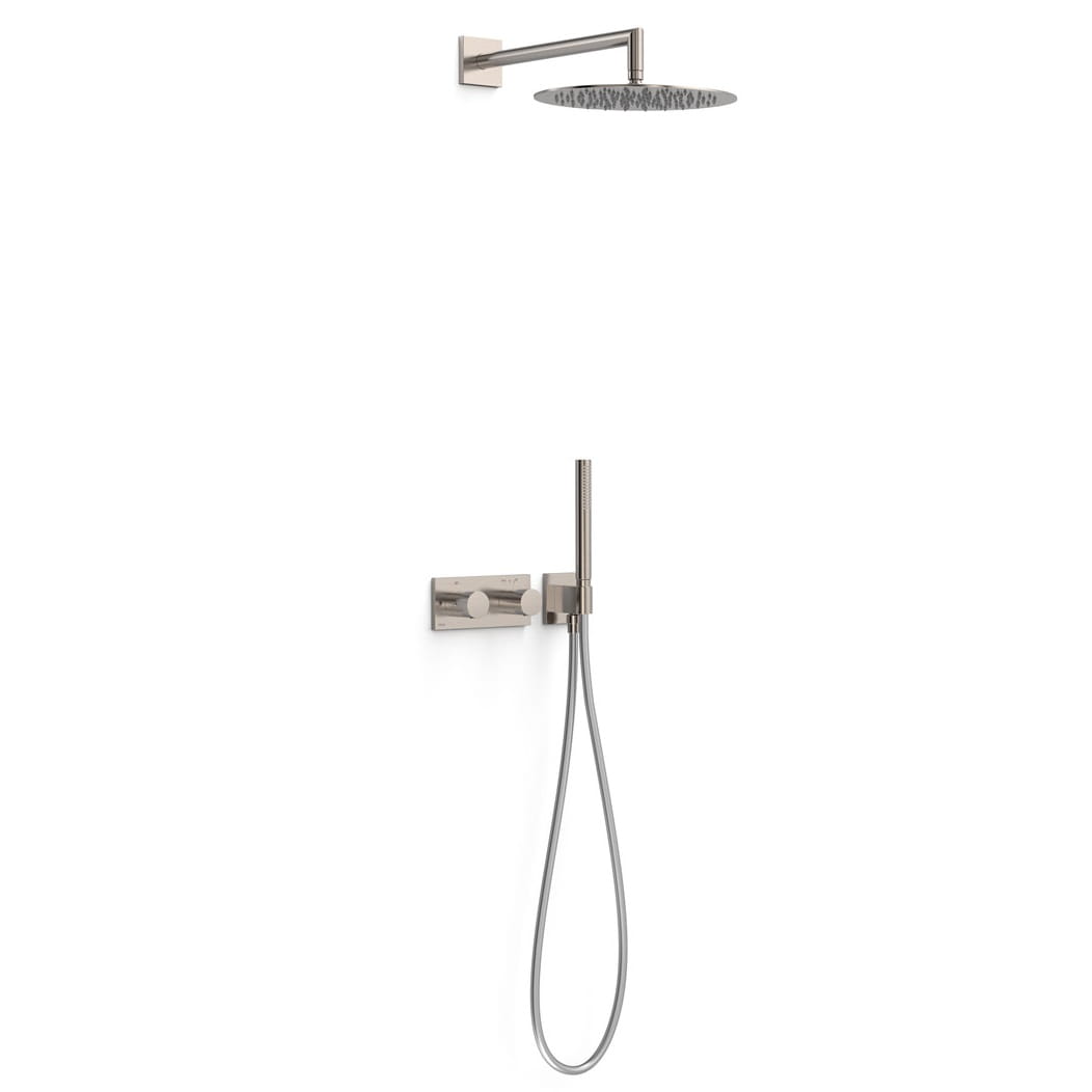 Główne cechy: - kolor: stal - rodzaj: zestaw natryskowy - typ: dwuuchwytowa/ termostatyczna - montaż: podtynkowa - w zestawie korpus podtynkowy termostatyczny o instalacji poziomej - regulator natężenia przepływu i rozgałęźnik 2-drożny - pokrętło okrągłe - ramię naścienne z obrotową deszczownicą ze stali nierdzewnej - uchwyt do słuchawki prysznicowej z przyłączem w ścianie - słuchawka prysznicowa z mosiądzu z systemem zapobiegającym osadzaniu się kamienia - satynowy wąż