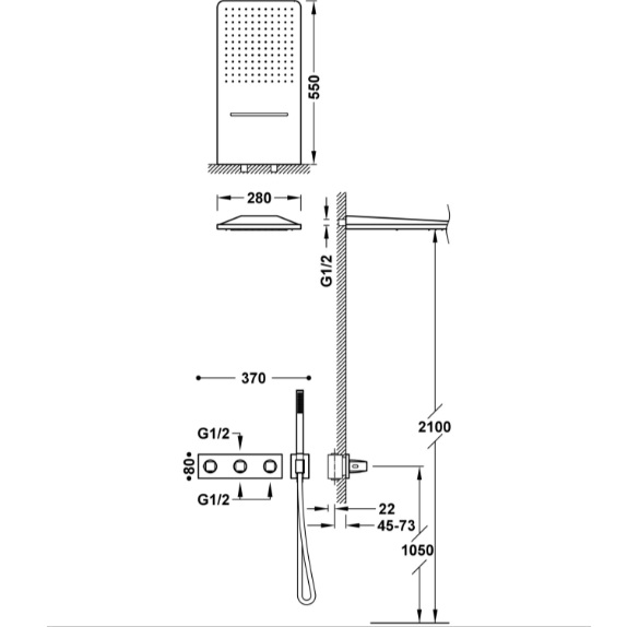Dane techniczne: - wymiary deszczownicy: 280x550 mm - długość baterii: 370 mm - szerokość baterii: 80 mm - średnica przyłącza: G1/2 - WAŻNE: Zamontować odpływ >50 l/min