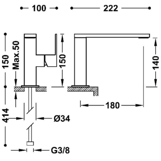 Dane techniczne: - długość baterii: 222 mm - wysokość baterii: 140 mm - zasięg wylewki: 180 mm - przyłącze: G 3/8