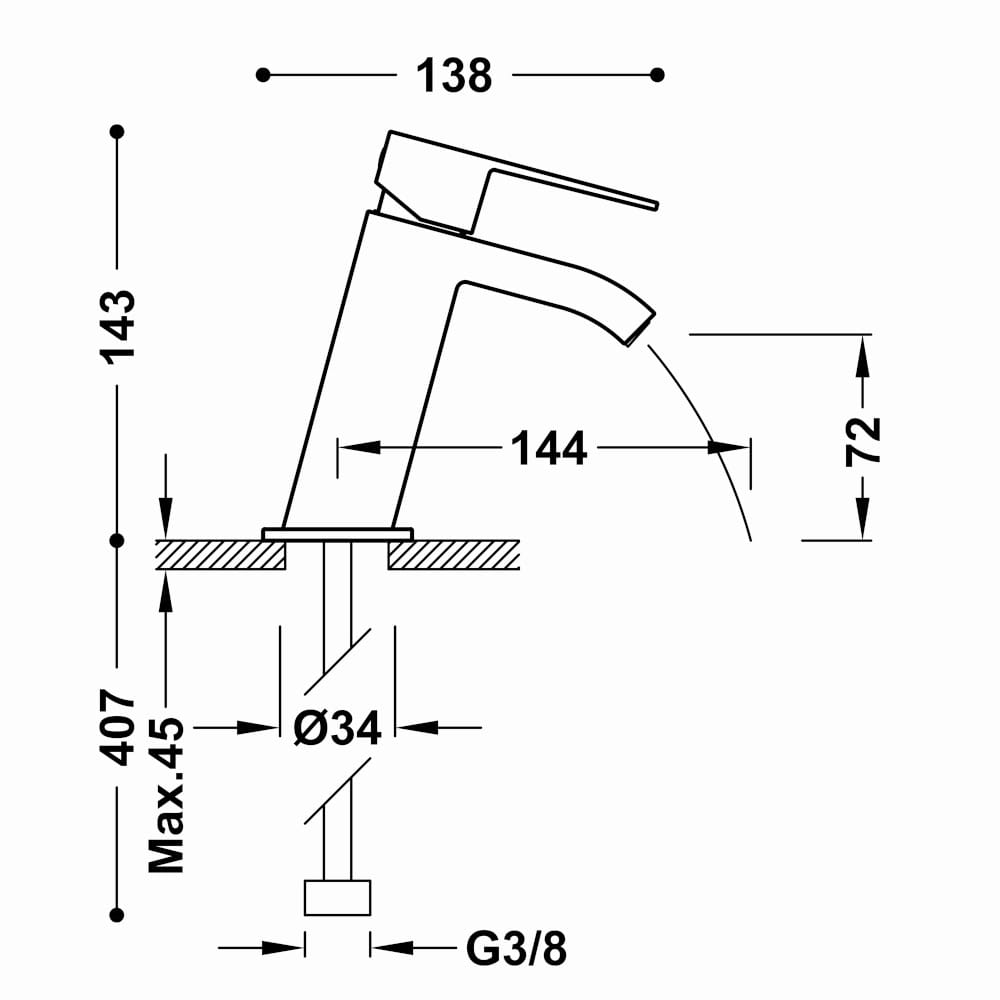 Dane techniczne: - długość wylewki: 138 mm - wysokość wylewki: 143 mm - przyłącze: G 3/8
