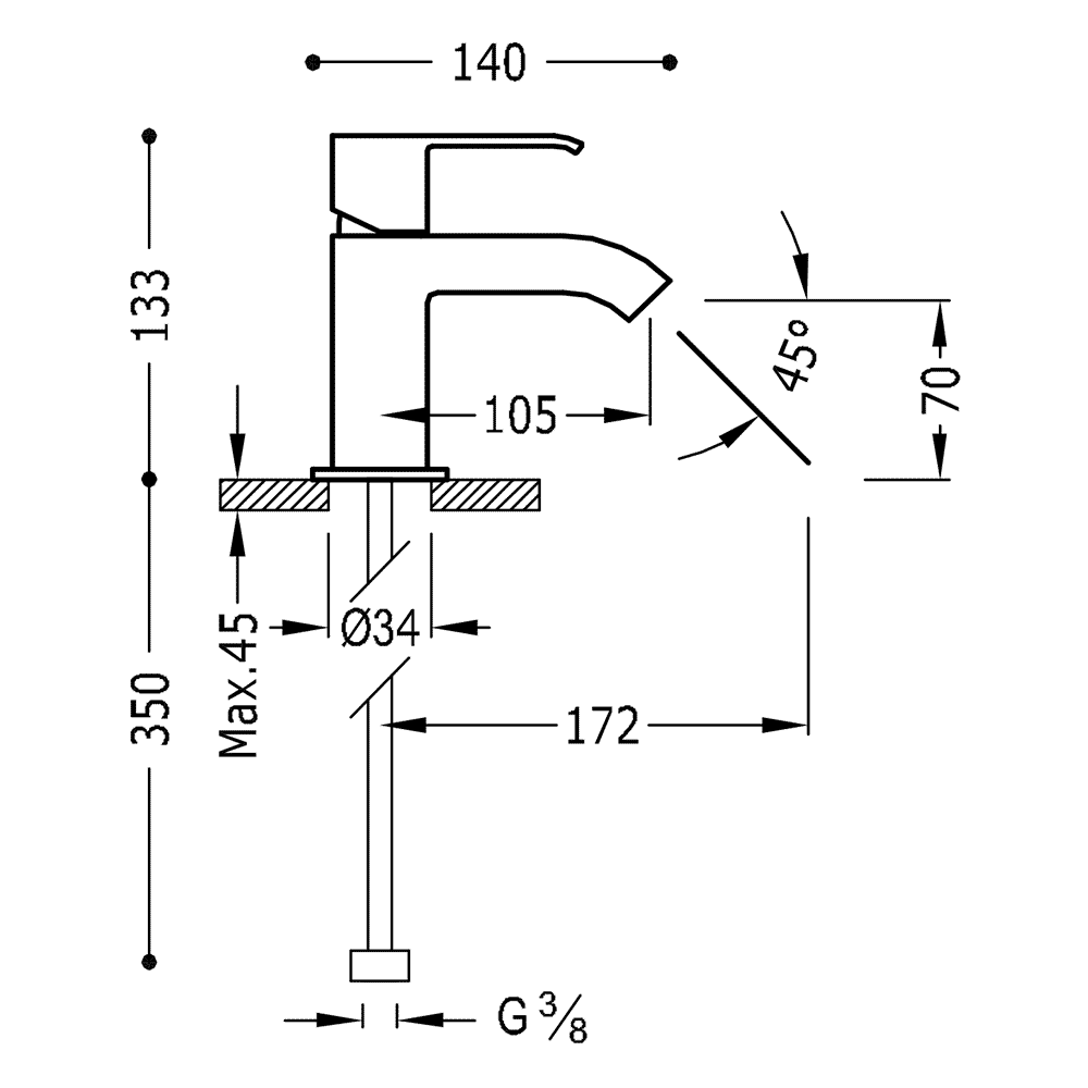 Dane techniczne: - długość wylewki: 105 mm - wysokość wylewki: 133 mm - przyłącze: G 3/8