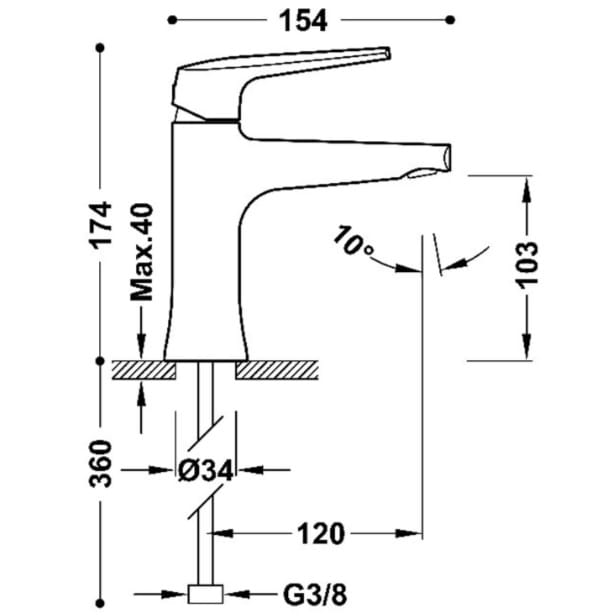 Dane techniczne: - wysokość baterii: 174 mm - długość baterii: 154 mm - zasięg wylewki: 120 mm - przyłącze G3/8"