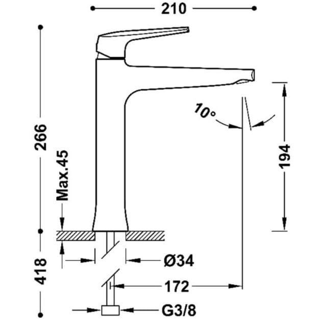 Dane techniczne: - wysokość baterii: 266 mm - długość baterii: 210 mm - zasięg wylewki: 172 mm - przyłącze G3/8"