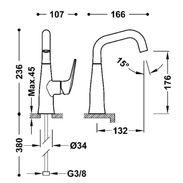 Dane techniczne: - wysokość baterii: 236 mm - długość baterii: 166 mm - zasięg wylewki: 132 mm - przyłącze G3/8"