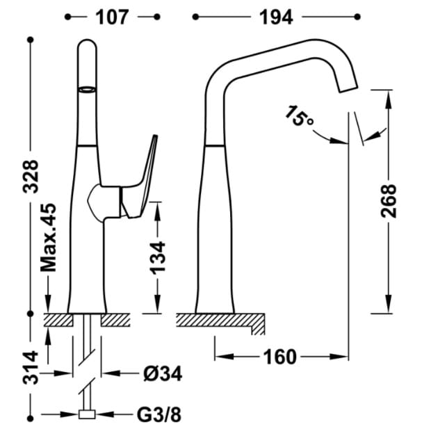 Dane techniczne: - wysokość baterii: 328 mm - długość baterii: 194 mm - zasięg wylewki: 160 mm - przyłącze G3/8"