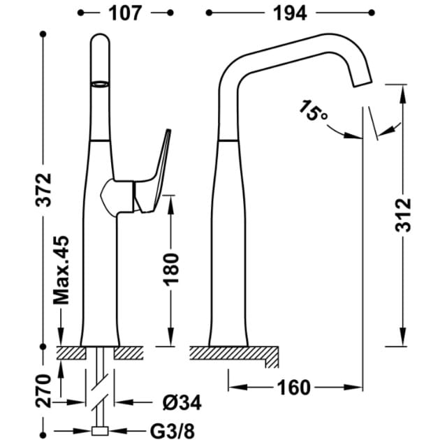 Dane techniczne: - wysokość baterii: 372 mm - długość baterii: 194 mm - zasięg wylewki: 160 mm - przyłącze G3/8"