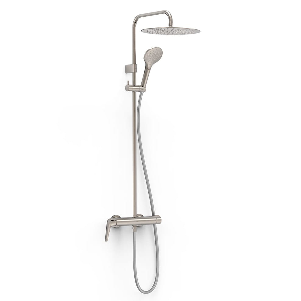 Główne cechy: - kolor: stal - rodzaj: natryskowy - typ: jednouchwytowa - montaż: naścienny - obrotowy i przesuwny uchwyt do słuchawki prysznicowej - deszczownica obrotowa ze stali nierdzewnej - słuchawka prysznicowa z systemem zapobiegającym osadzaniu się kamienia