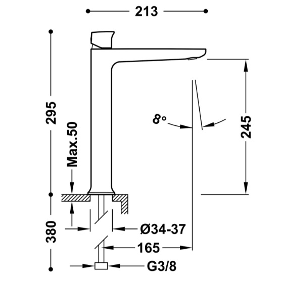 Dane techniczne: - przepływ wody [l/min]: 5,7 - zasięg wylewki : 165 mm - wysokość baterii: 295 mm