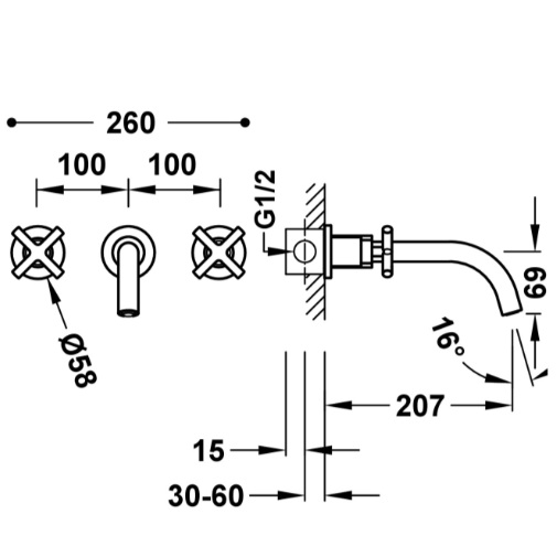 Dane techniczne: - zasięg wylewki: 207 mm - średnica przyłącza: 1/2" - kąt obrotu pokręteł: 90 - przepływ (l/min): 5,7
