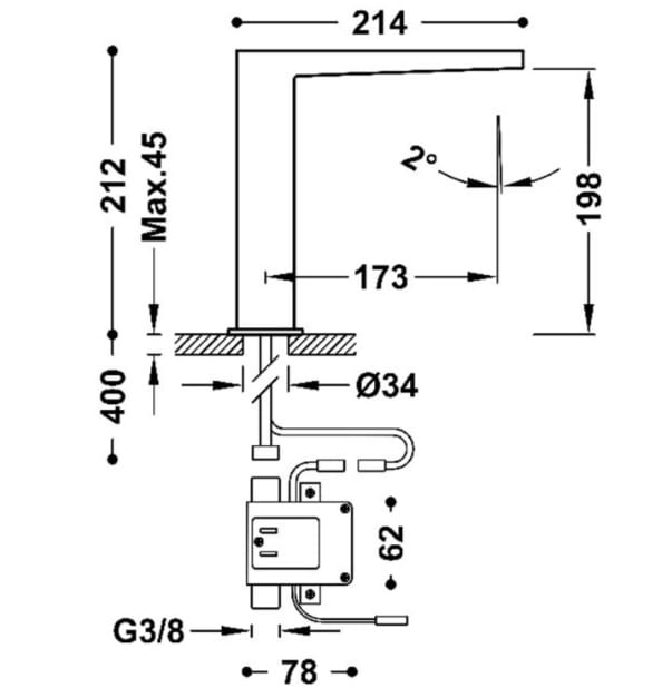 Dane techniczne: - wysokość baterii: 212 mm - długość baterii: 214 mm - zasięg wylewki: 173 mm