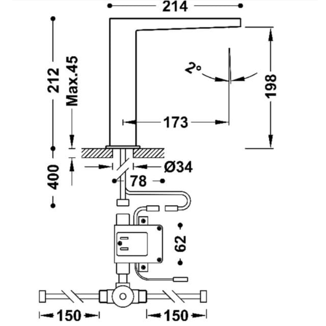 Dane techniczne: - wysokość baterii: 212 mm - długość baterii: 214 mm - zasięg wylewki: 173 mm