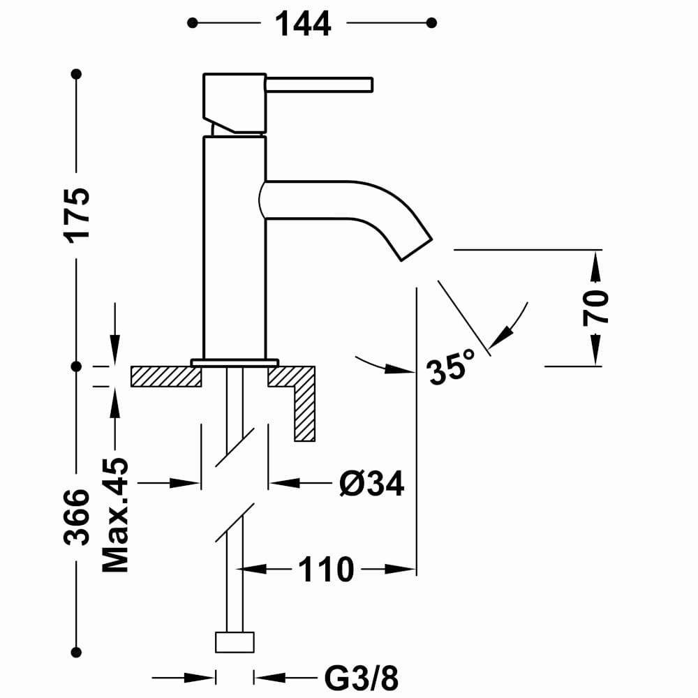 Dane techniczne: - wysokość baterii: 175 mm - długość wylewki: 144 mm - zasięg wylewki: 110 mm - przyłącza G 3/8