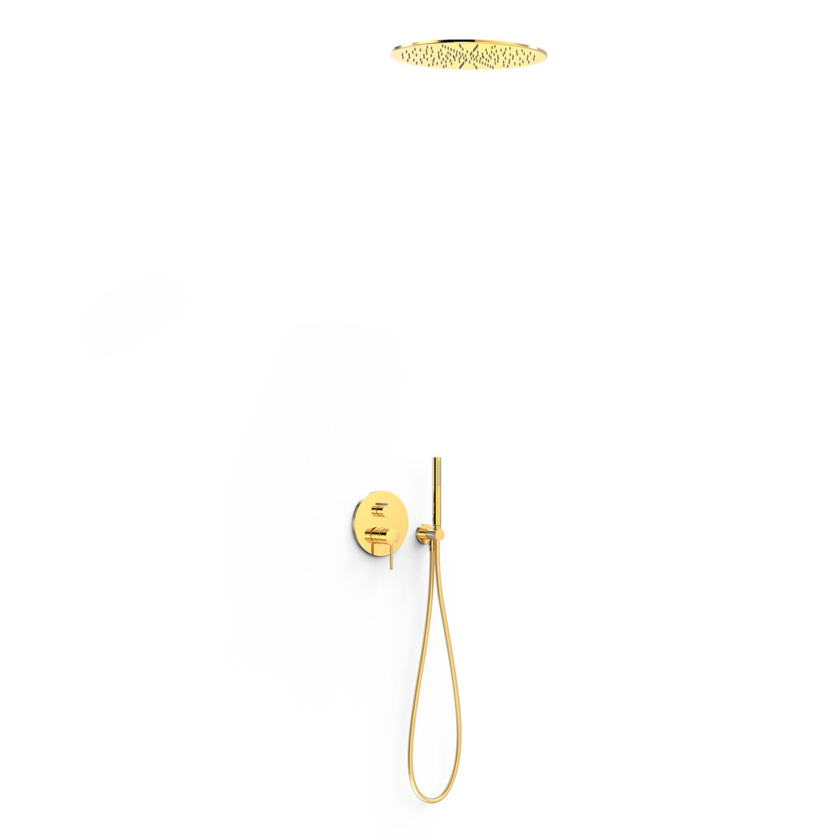 Główne cechy: - kolor: 24-K złoto - montaż: podtynkowy - typ: jednouchwytowy - rodzaj: natryskowy - przełącznik funkcji 2-drogowy - deszczownia podtynkowa sufitowa ze stali nierdzewnej: Ø 405 mm - uchwyt do słuchawki prysznicowej z przyłączem w ścianie - słuchawka prysznicowa z mosiądzu systemem zapobiegającym osadzaniu się kamienia - satynowy wąż - natrysk ręczny z mosiądzu - sitko ze stali nierdzewnej